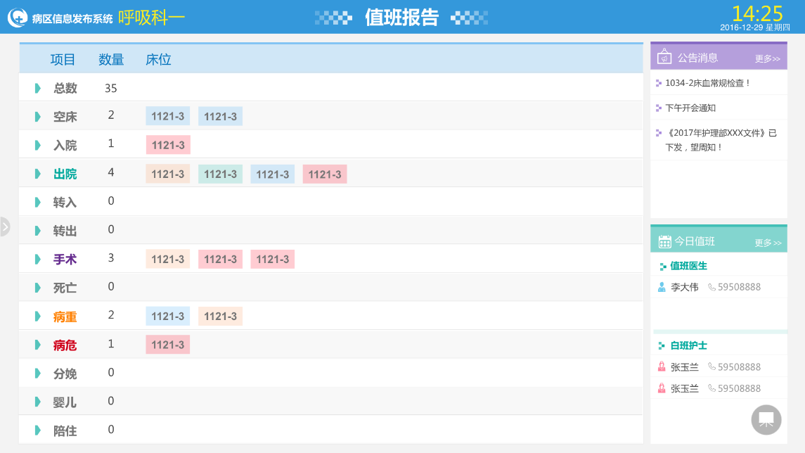 智能統(tǒng)計(jì)并展示,今日全員患者值班信息,快速了解病區(qū)情況,包括出入院情況、手術(shù)、病危等數(shù)據(jù)的自動統(tǒng)計(jì)。