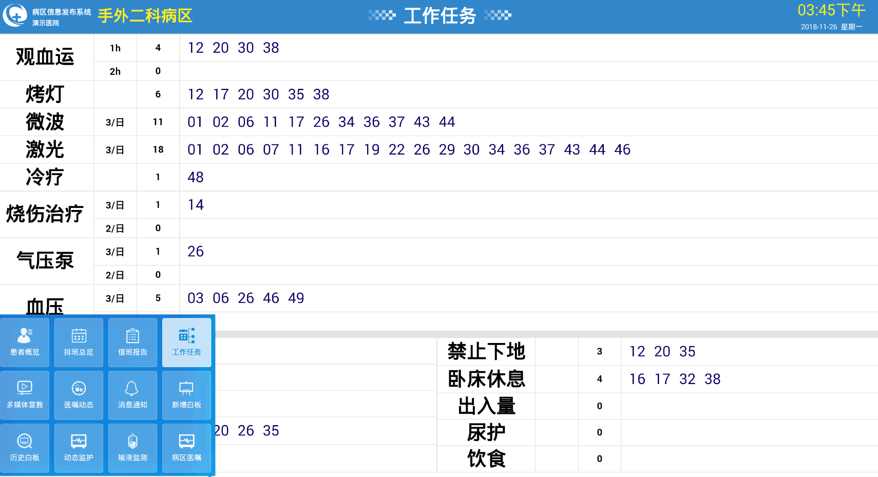 護(hù)理交互大屏通過對臨床護(hù)理信息和醫(yī)療物聯(lián)設(shè)備信息的抓取、整合、分析、重組,實(shí)現(xiàn)信息可視化顯示并搭建人機(jī)交互的平臺。該平臺不僅能從傳統(tǒng)的HIS工作站和移動護(hù)士工作站中抓取臨床護(hù)理信息,還可以將臨床護(hù)理信息進(jìn)行解析、分類、結(jié)構(gòu)化顯示。交互大屏集成了臨床護(hù)理中頻繁使用的信息模塊,如患者電子概覽板、排班總覽、值班報(bào)告、工作任務(wù)、健康宣教等功能。