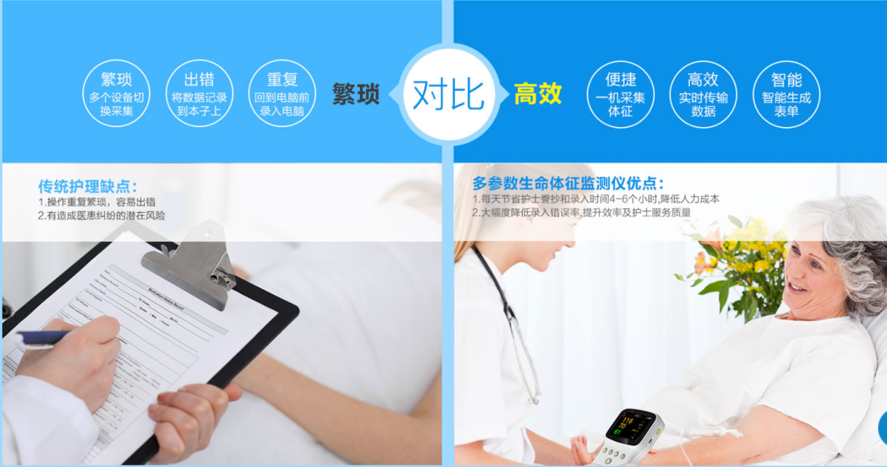 護(hù)士可通過一個設(shè)備采集多項(xiàng)患者體征,如體溫、血壓、血糖、脈搏、血氧等,并將數(shù)據(jù)傳送回服務(wù)器從而同步到患者相應(yīng)的移動護(hù)理、電子病歷等患者在院診療系統(tǒng)上。