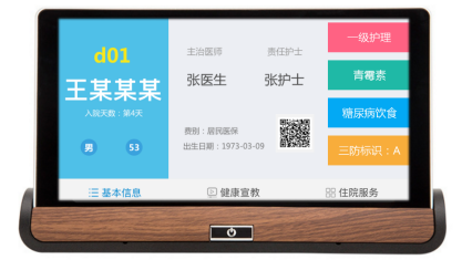 患者可通過桌牌或平板了解自身當(dāng)前病情狀態(tài),費(fèi)用查詢并完成在線支付;可以查看多媒體宣教學(xué)習(xí)相關(guān)病理知識,盡量配合醫(yī)護(hù)工作;查看醫(yī)院最新動態(tài)消息,如某某專甲今日在我院出診等等;可以訂餐,通過與醫(yī)院食堂對接數(shù)據(jù)完成訂餐操作。
