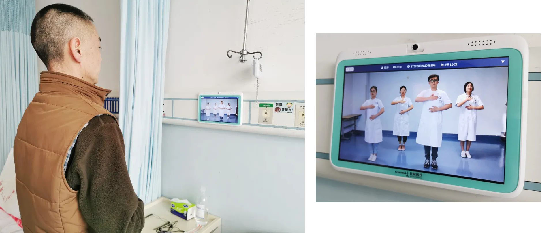 在市中心醫(yī)院心胸外科病房,剛?cè)朐旱牧质迨逭龑?duì)著病床床頭的電子屏幕跟著醫(yī)護(hù)人員一起做呼吸訓(xùn)練操……林叔叔因肺部結(jié)節(jié)入院準(zhǔn)備手術(shù),術(shù)前術(shù)后的呼吸訓(xùn)練能幫助他快速康復(fù),“以前我們會(huì)把患者集中組織起來(lái)教他們做呼吸訓(xùn)練操,但是可能學(xué)一次就忘了,現(xiàn)在我們把這些健教視頻放在患者床頭的電子屏上,患者可隨時(shí)可以點(diǎn)進(jìn)去跟著練習(xí),”護(hù)士長(zhǎng)李金學(xué)介紹,“除此之外,林叔叔還可以通過這塊屏幕實(shí)現(xiàn)診療計(jì)劃查詢、床旁掃碼繳費(fèi)、費(fèi)用明細(xì)查詢……以后我們還想利用這套信息系統(tǒng)完成床旁結(jié)算,患者從住院到出院,在病房就能一站式完成。”